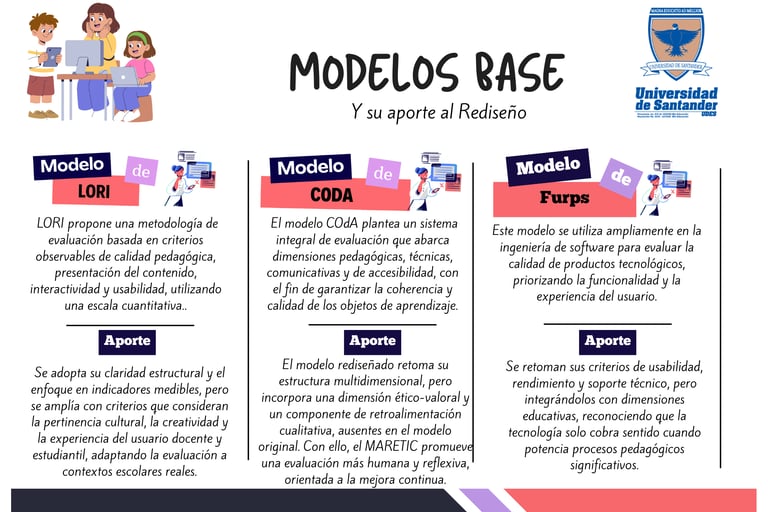 El modelo integra, adapta y amplía los aportes de tres marcos teóricos principales: COdA, por su estructura metodológica integral; LORI, por su claridad operativa y enfoque en la calidad pedagógica; y FURPS, por su precisión técnica y atención a la usabilidad y rendimiento del recurso. Estos fundamentos se complementan con aportes de autores contemporáneos que abordan la evaluación desde dimensiones pedagógicas, comunicativas, éticas y culturales, enriqueciendo el modelo con una mirada más humana y reflexiva.